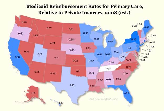 Health policy analyst Avik Roy of the Manhattan Institute has produced a map showing the reimbursement rates for Medicaid relative to private insurance.
